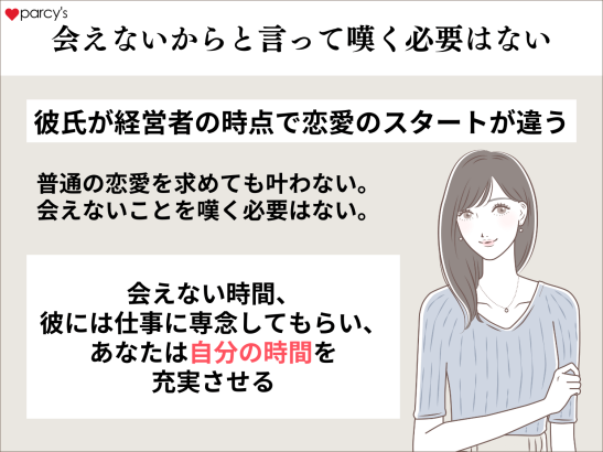 ただ忙しいというだけでなく、彼氏が経営者となると一緒にいる時間が少なく、会う時間が取れない、連絡さえままならないということも起こり得る。