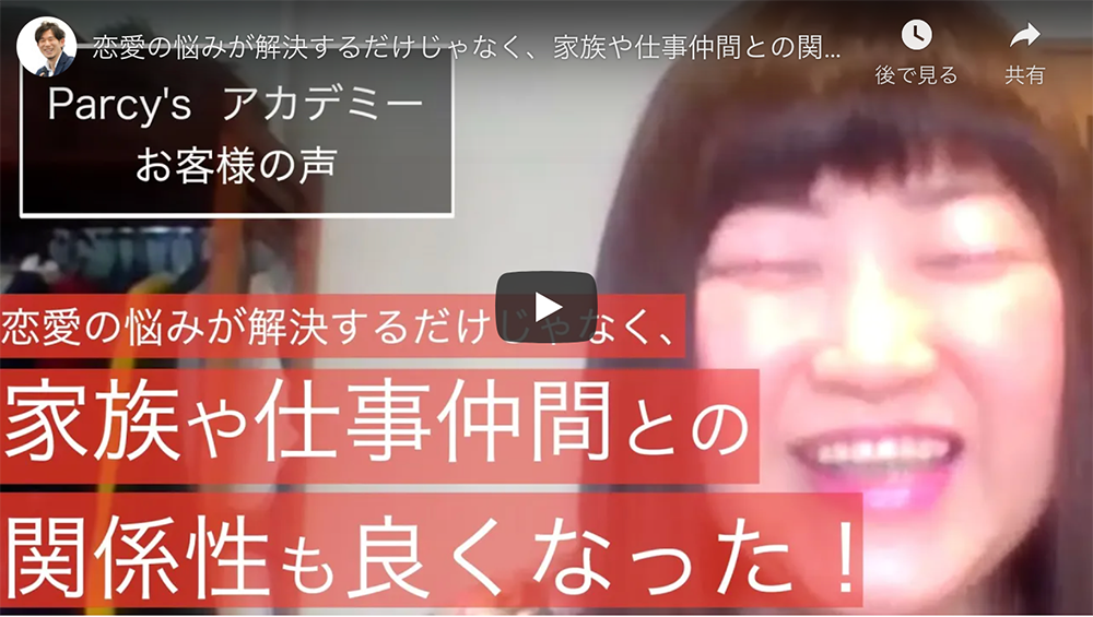 受講を終えた今では、周囲の方々にも「parcy’sプログラム」をおすすめしてくれているという彼女が、どんなことを学び、どういう風に変化したのか、インタビュー動画と共に見て欲しい。バツイチの人だけじゃなくて、婚活中の人も必見だよ。