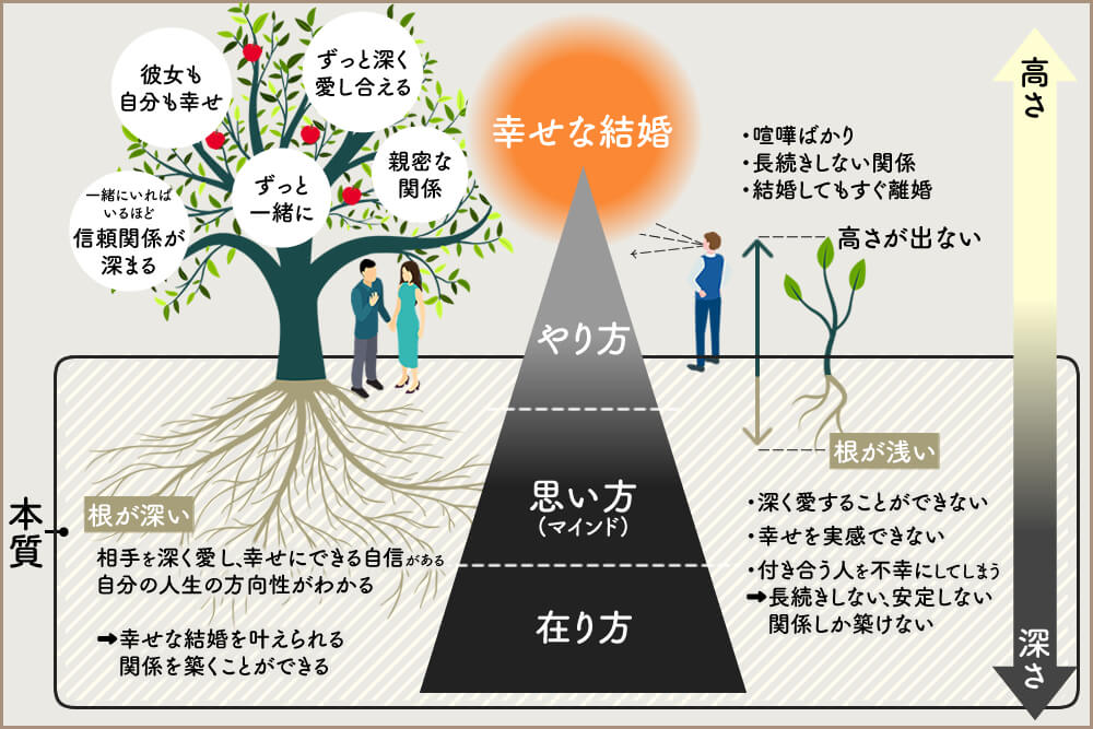 以前の記事「【男性向け】幸せな結婚をするための「学ぶべき順番」」でも伝えたが、やり方=恋愛テクニックや男女心理などだけを学んでも、根が浅く弱い樹木が大きく育たないのと同じで、幸せな結婚まで届くことはない。
