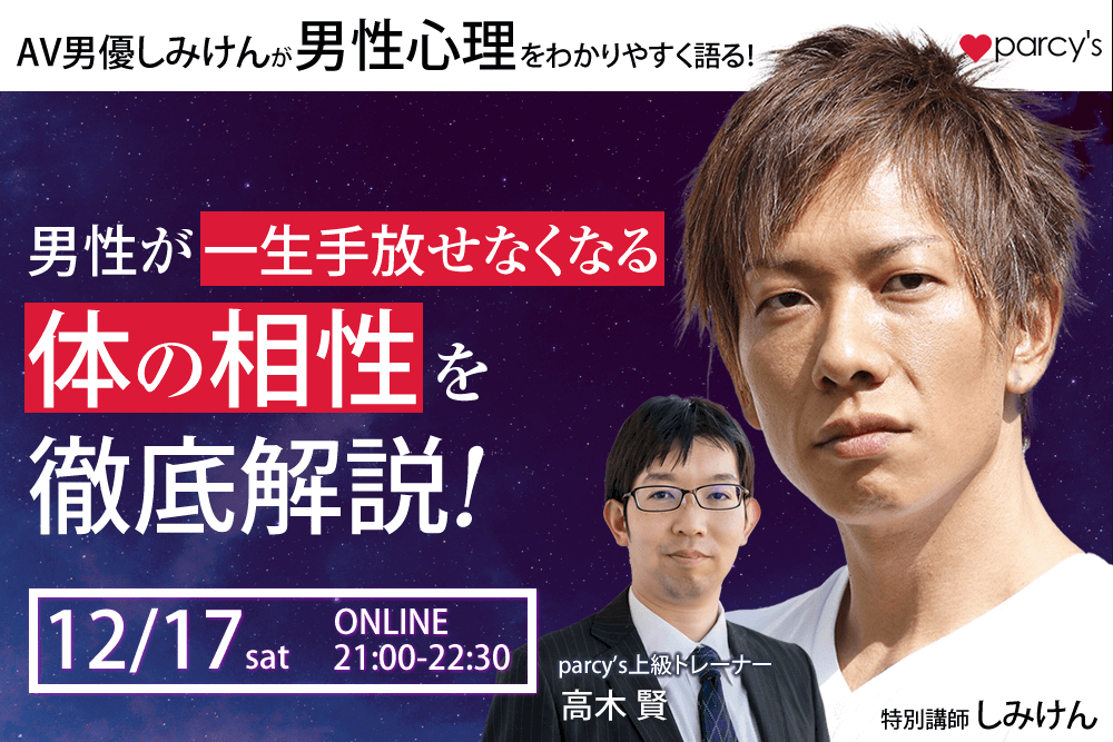 parcy’sでとてもニーズが高い男性心理や男性の本音を、プロとして1万人以上の女性とセックス経験があるAV男優で日本一有名なしみけんさんにわかりやすく語ってもらう。