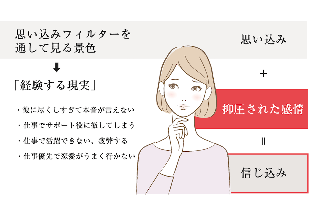 「思い込み」+「抑圧された感情(我慢した感情、本当は欲しかったという想い、満たされなかった欲求)」