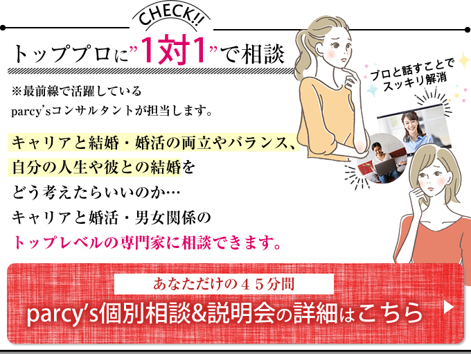 こじらせ婚活を卒業!1年以内に自分らしい幸せな結婚する!parcy's個別相談&説明会はこちら