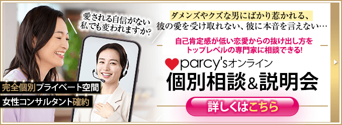 『心から信頼し合える幸せな結婚と自己肯定感の関係を徹底解説』です。 今だけ無料です!ぜひ参加してくださいませ。 →parcy'sオンラインセミナーはこちら 出会いや相手の本気度だけが原因で結婚できないと思っていませんか?自分も変わらないと婚活や結婚はうまくいきません。 「parcy's」(パーシーズ)は、「結婚・出産のタイムリミットを感じて焦る」「婚活が長期化している」「付き合っても長続きせず結婚まで進まない」「好きな人と毎回同じパターンで別れてしまう」 そんな悩みを抱える方に、1年以内に自分らしい幸せな結婚を実現するためのトレーニングスタジオだ。 parcy'sで学ぶと、以下のような恋愛・結婚・婚活でおこりがちな悩みから抜け出すことができる。