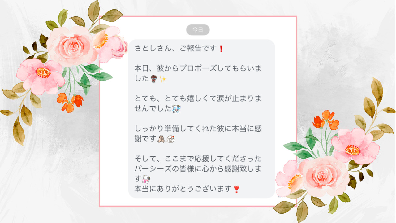 2023.06.23 AKIRA parcy’s (6) FacebookでシェアTwitterでシェア Tweet FacebookでシェアTwitterでシェア parcy's note(パーシーズノート) > Full width page > parcy’sメソッド > 自己肯定感を高める方法 > <動画>parcy’sトレーニングお客様の声!parcy’sで理想の旦那さんを見つけました! > parcy’s (6)