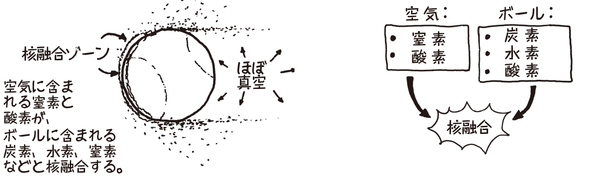 ボールの前で核融合が起こりつづけるので、ボールは押し戻され、スピードが落ちる。まるで、エンジンを稼働させた状態で逆向きに飛んでいるロケットだ。だが残念ながら、ボールの速度があまりに大きいため、この熱核融合でものすごい力が生じても、ボールはたいして減速しない。とはいえ、やがてボールの表面はむしばまれはじめ、ボールの超微小片が四方八方に吹き飛ばされる。この超微小片は超高速で飛び散っているので、空気分子とぶつかると、あらたに核融合のプロセスが2つ3つ引き起こされる。