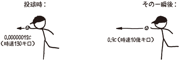 どうやってそんなスピードの球を投げるかという問題はわきに置いておくことにしよう。ピッチャーは普通にボールを投げるとし、ピッチャーの手から離れた瞬間、ボールは何か摩訶不思議な手段で0.9c(cは光速度)まで加速するものとしよう。それ以降は、すべては普通の物理学にしたがって進む。