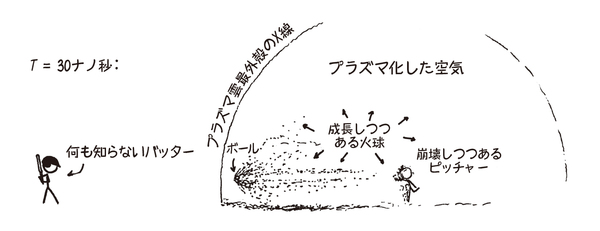 ガンマ線も核融合生成物の破片も、ピッチャー・マウンドを中心に、球形に広がっていく。巨大な泡のように。ガンマ線と核融合生成物は、空気中の分子の原子核から電子を奪い去り、空気分子をずたずたに破壊しはじめる。球場内の空気は高温のプラズマと化し、膨張する。この「ガンマ線+核生成物」の球の表面は、ボールそのものよりもほんの少しだけ先に、光速に近いスピードでバッターに近づく。