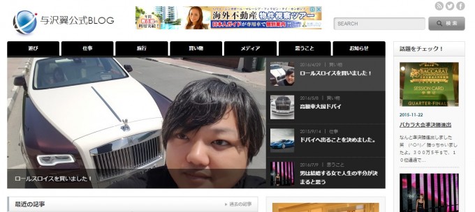 彼のブログは、与沢翼という人間をたくさんの角度から記事にできるように、ニュースタイプのwordpressテーマが使われている。