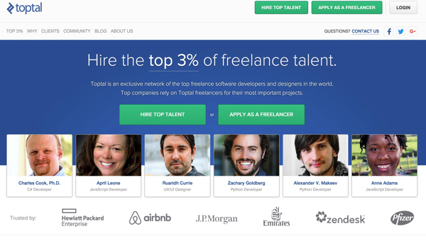 ここに挙げている他のサービスリストとは少し違ったアプローチだが、トプタル(Toptal)は経験豊かで才能のあるフリーランス向けである。トプタルスクリーニングプロセスを経ると、すばらしいクライアント(JPモーガンやゼンデスク、Airbnbなど)や公平な報酬(低報酬のコンテストはない)といった有意義なプロジェクトなど、これまでにないようなアクセスをすることができる。たくさんのミーティングや技術イベントのトプタルコミュニティーに参加することができる。