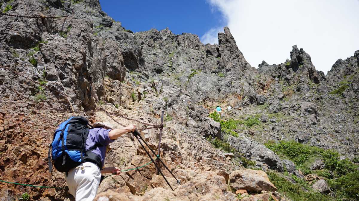 ただし、稜線は山の一番角度が高い頂上を横づたいに歩くので、道がけわしい・・・。