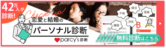 あなたの結婚をつかみとる力&1年以内の結婚確率を診断してみよう。恋愛・結婚のパーソナル診断「parcy’s診断」では、企業で用いられる適性検査レベルの高精度分析アルゴリズムにより、あなたが抱える結婚の課題と改善点が一目でわかるようになっている。
