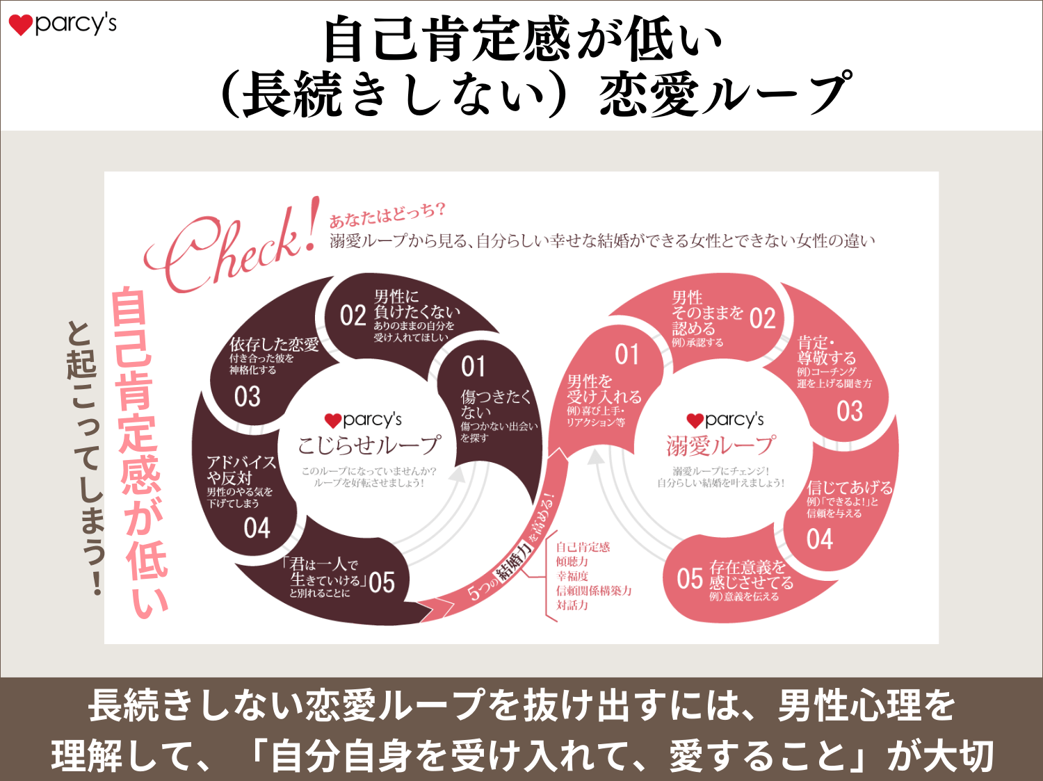 『心から信頼し合える幸せな結婚と自己肯定感の関係を徹底解説』です。 今だけ無料です!ぜひ参加してくださいませ。 →parcy'sオンラインセミナーはこちら 出会いや相手の本気度だけが原因で結婚できないと思っていませんか?自分も変わらないと婚活や結婚はうまくいきません。 「parcy's」(パーシーズ)は、「結婚・出産のタイムリミットを感じて焦る」「婚活が長期化している」「付き合っても長続きせず結婚まで進まない」「好きな人と毎回同じパターンで別れてしまう」 そんな悩みを抱える方に、1年以内に自分らしい幸せな結婚を実現するためのトレーニングスタジオだ。 parcy'sで学ぶと、以下のような恋愛・結婚・婚活でおこりがちな悩みから抜け出すことができる。